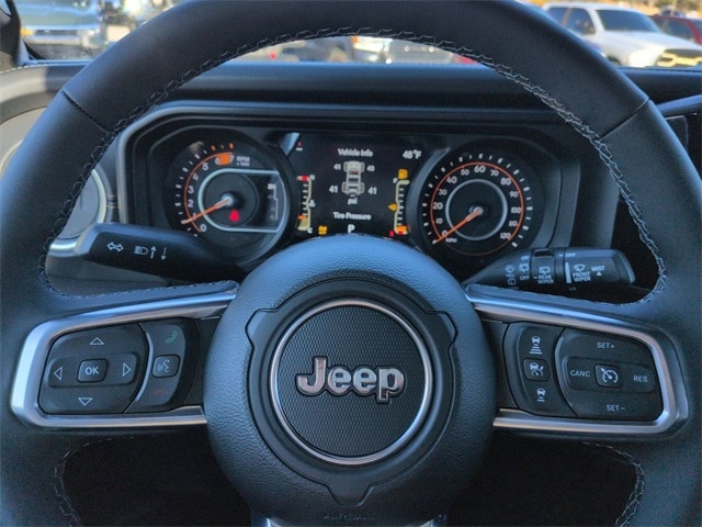 Quick Order Package 24G, Sahara Popular Equipment Group (12.3" Touchscreen Display, 4G LTE Wi-Fi Hot Spot, Alpine Premium Audio System, Apple CarPlay, Auto High Beam Headlamp Control, Auto-Dimming Rear-View Mirror, Blind Spot & Cross Path Detection, Connected Travel & Traffic Services, Connectivity - US/Canada, For More Info, Call 800-643-2112, Google Android Auto, GPS Navigation, Hard Seat Back, HD Radio, Integrated Center Stack Radio, Integrated Off-Road Camera, Integrated Voice Command w/Bluetooth, Leather Wrapped Park Brake Handle, Leather Wrapped Shift Knob, McKinley Trimmed Seats, ParkSense Rear Park Assist System, Power 4-Way Driver Lumbar Adjust, Power 4-Way Passenger Lumbar Adjust, Power Adjust 8-Way Driver Seat, Power Adjust 8-Way Front Passenger Seat, Radio: Uconnect 5 Nav w/12.3" Display, Side Steps, SiriusXM Radio Service, SiriusXM w/360L, and Universal Garage Door Opener), 3.45 Overall Top Gear Ratio, 4-Wheel Disc Brakes, 8 Speakers, ABS brakes, Air Conditioning, Alloy wheels, AM/FM radio: SiriusXM with 360L, Apple CarPlay/Android Auto, Automatic temperature control, Aux Battery, Brake assist, Cloth Low-Back Bucket Seats, Compass, Delay-off headlights, Driver door bin, Driver vanity mirror, Dual front impact airbags, Dual front side impact airbags, Electronic Stability Control, Emergency communication system: Jeep Connect, Front anti-roll bar, Front Bucket Seats, Front Center Armrest w/Storage, Front dual zone A/C, Front fog lights, Front reading lights, Fully automatic headlights, Heated door mirrors, Heated front seats, Heated steering wheel, Heavy Duty Suspension w/Gas Shocks, Illuminated entry, Integrated roll-over protection, Low tire pressure warning, MOPAR All-Weather Floor Mats, Non-Lock Fuel Cap w/o Discriminator, Occupant sensing airbag, Outside temperature display, Overhead airbag, Panic alarm, ParkView Rear Back-Up Camera, Passenger door bin, Passenger vanity mirror, Power door mirrors, Power steering, Power Top Quarter Window Storage Bag, Power windows, Radio data system, Radio: Uconnect 5 w/12.3" Display, Rear anti-roll bar, Rear reading lights, Rear Window Defroster, Rear Window Wiper/Washer, Remote keyless entry, Removable Rear Quarter Windows, Security system, Sky One-Touch Power Top, Speed control, Split folding rear seat, Steering wheel mounted audio controls, Stop-Start Dual Battery System, Tachometer, Telescoping steering wheel, Tilt steering wheel, Traction control, Trip computer, Variably intermittent wipers, Voltmeter, and Wheels: 18" x 7.5" Machine/Painted Gray.